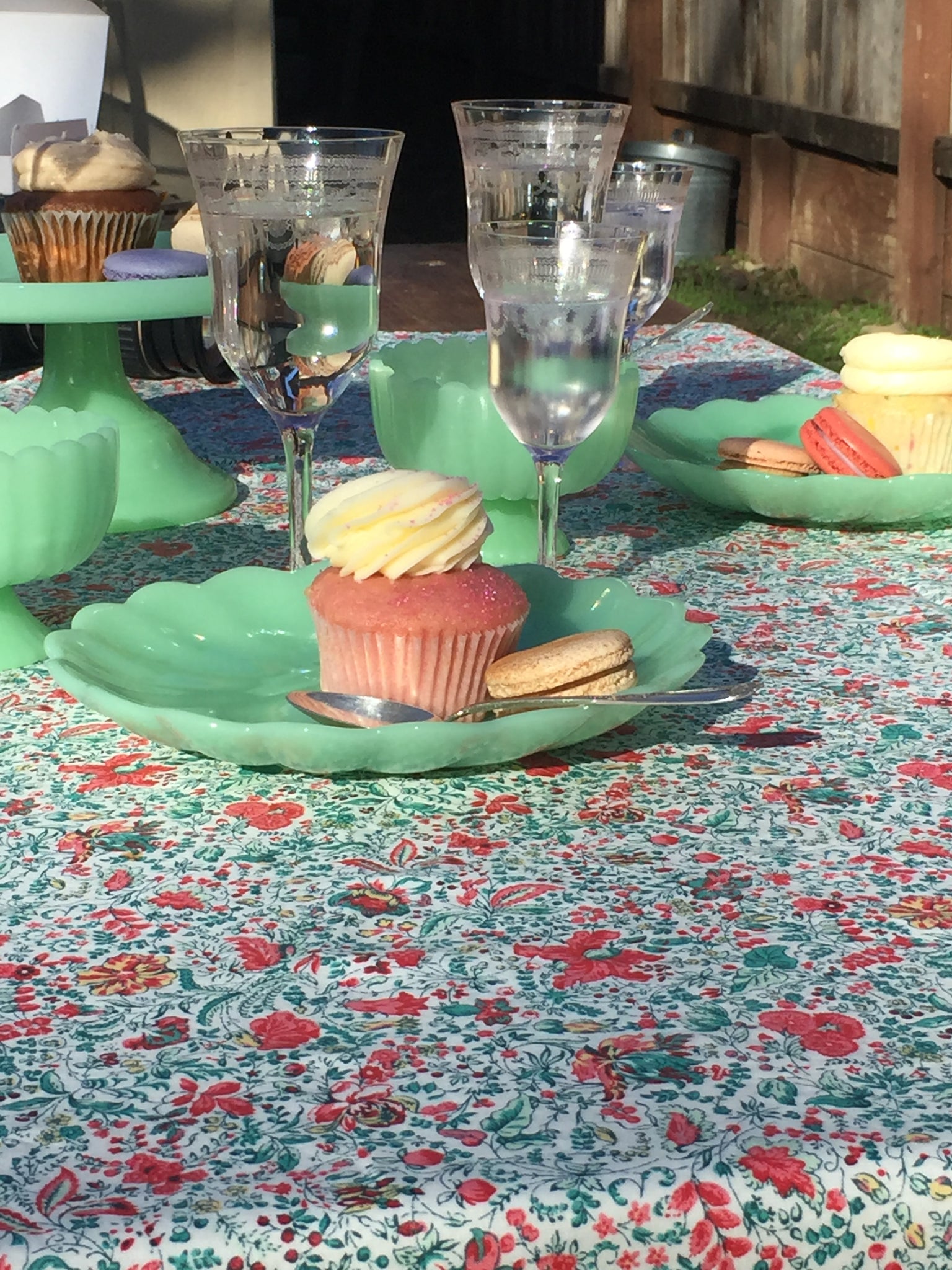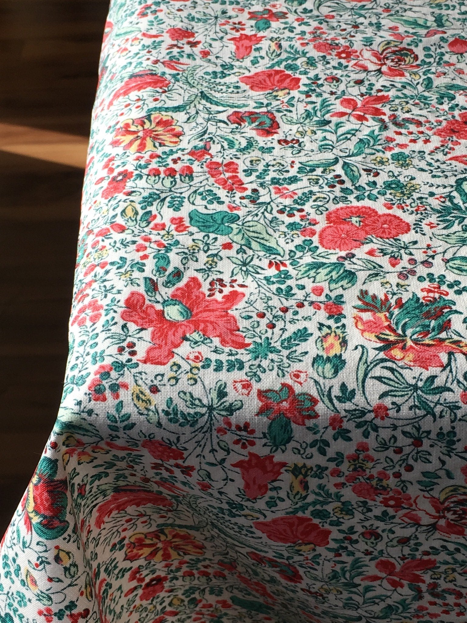 Inspired by the markets of India with vivid greens and pink-orange flowers, this airy, floral tablecloth brightens the table year round.